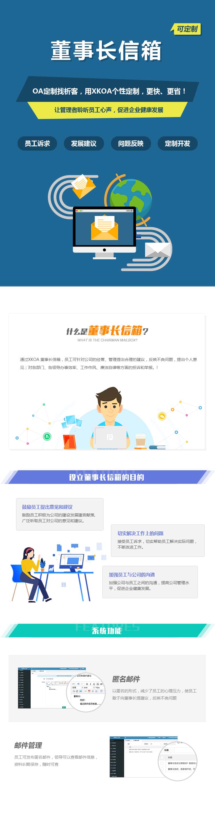 通过XKOA 董事长信箱,员工可针对公司的经营、管理提出合理的建议,反映不良问题,提出个人意见;对各部门、各领导办事效率、工作作风、廉洁自律等方面的投诉和举报。